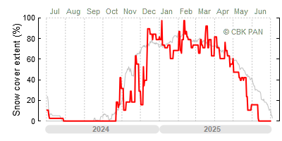 We would call a winter "harsh" if snow cover persisted for a long time and covered the largest possible area of the country. An example of such a situation in Poland is the winter of 2005/06, when snow covered almost the entire country from mid-December until the end of April. This significantly impacted the average for the entire year—statistically, on each day between July 1, 2005, and June 30, 2006, snow cover extended over as much as one-third of Poland!