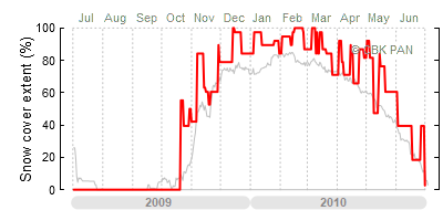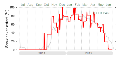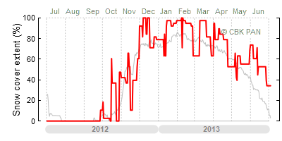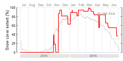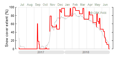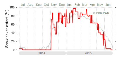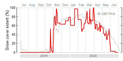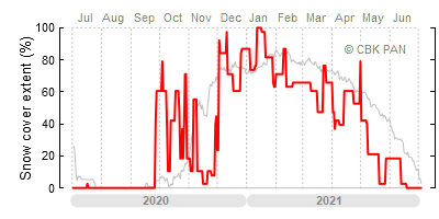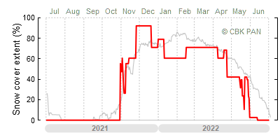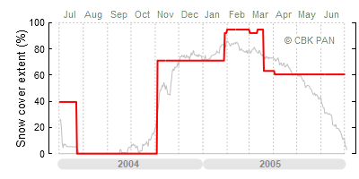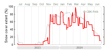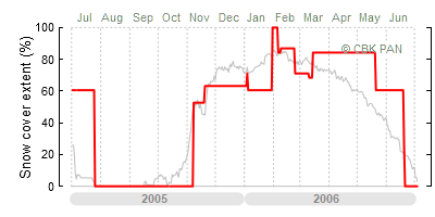 We would call a winter "harsh" if snow cover persisted for a long time and covered the largest possible area of the country. An example of such a situation in Poland is the winter of 2005/06, when snow covered almost the entire country from mid-December until the end of April. This significantly impacted the average for the entire year—statistically, on each day between July 1, 2005, and June 30, 2006, snow cover extended over as much as one-third of Poland!