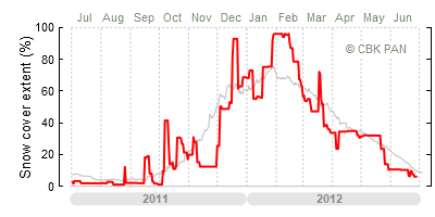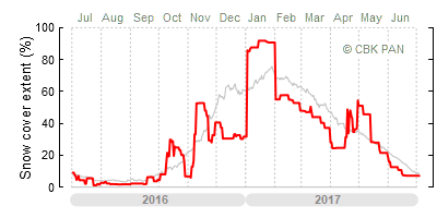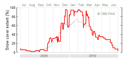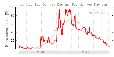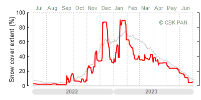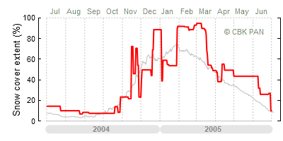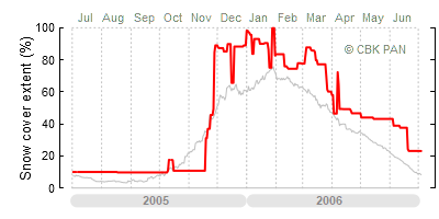 We would call a winter "harsh" if snow cover persisted for a long time and covered the largest possible area of the country. An example of such a situation in Poland is the winter of 2005/06, when snow covered almost the entire country from mid-December until the end of April. This significantly impacted the average for the entire year—statistically, on each day between July 1, 2005, and June 30, 2006, snow cover extended over as much as one-third of Poland!