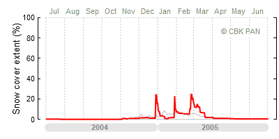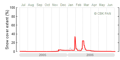 We would call a winter "harsh" if snow cover persisted for a long time and covered the largest possible area of the country. An example of such a situation in Poland is the winter of 2005/06, when snow covered almost the entire country from mid-December until the end of April. This significantly impacted the average for the entire year—statistically, on each day between July 1, 2005, and June 30, 2006, snow cover extended over as much as one-third of Poland!