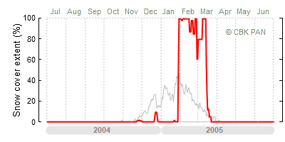 We would call a winter "harsh" if snow cover persisted for a long time and covered the largest possible area of the country. An example of such a situation in Poland is the winter of 2005/06, when snow covered almost the entire country from mid-December until the end of April. This significantly impacted the average for the entire year—statistically, on each day between July 1, 2005, and June 30, 2006, snow cover extended over as much as one-third of Poland!