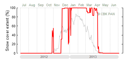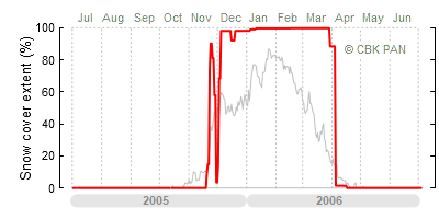 We would call a winter "harsh" if snow cover persisted for a long time and covered the largest possible area of the country. An example of such a situation in Poland is the winter of 2005/06, when snow covered almost the entire country from mid-December until the end of April. This significantly impacted the average for the entire year—statistically, on each day between July 1, 2005, and June 30, 2006, snow cover extended over as much as one-third of Poland!