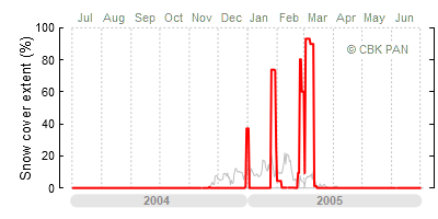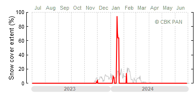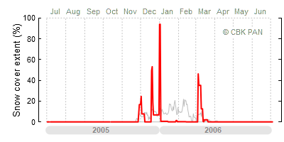 We would call a winter "harsh" if snow cover persisted for a long time and covered the largest possible area of the country. An example of such a situation in Poland is the winter of 2005/06, when snow covered almost the entire country from mid-December until the end of April. This significantly impacted the average for the entire year—statistically, on each day between July 1, 2005, and June 30, 2006, snow cover extended over as much as one-third of Poland!