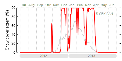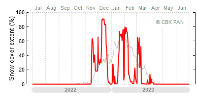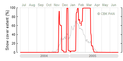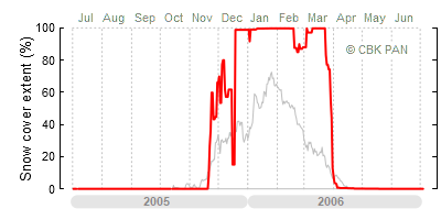We would call a winter "harsh" if snow cover persisted for a long time and covered the largest possible area of the country. An example of such a situation in Poland is the winter of 2005/06, when snow covered almost the entire country from mid-December until the end of April. This significantly impacted the average for the entire year—statistically, on each day between July 1, 2005, and June 30, 2006, snow cover extended over as much as one-third of Poland!