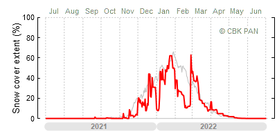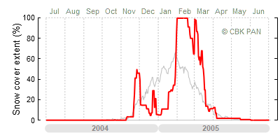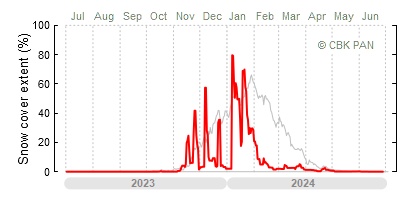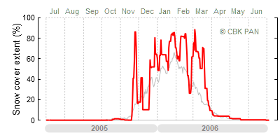 We would call a winter "harsh" if snow cover persisted for a long time and covered the largest possible area of the country. An example of such a situation in Poland is the winter of 2005/06, when snow covered almost the entire country from mid-December until the end of April. This significantly impacted the average for the entire year—statistically, on each day between July 1, 2005, and June 30, 2006, snow cover extended over as much as one-third of Poland!