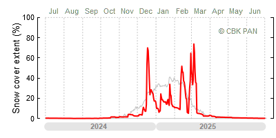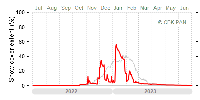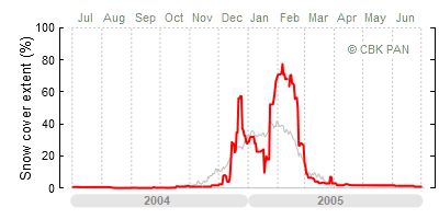 We would call a winter "harsh" if snow cover persisted for a long time and covered the largest possible area of the country. An example of such a situation in Poland is the winter of 2005/06, when snow covered almost the entire country from mid-December until the end of April. This significantly impacted the average for the entire year—statistically, on each day between July 1, 2005, and June 30, 2006, snow cover extended over as much as one-third of Poland!