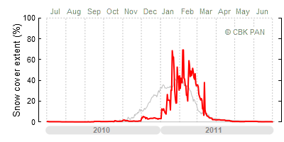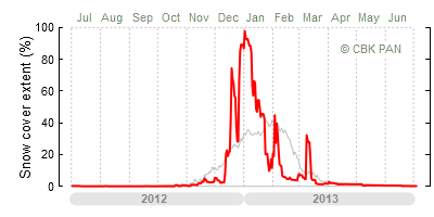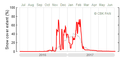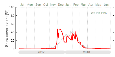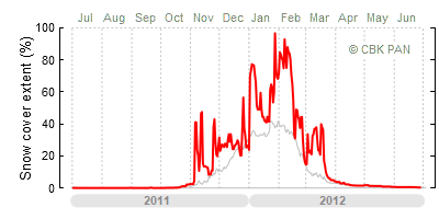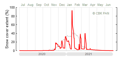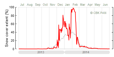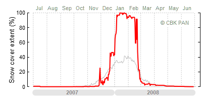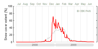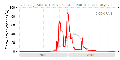 A mild winter is one where snow cover appears and quickly disappears, only occasionally covering more than 80-90 percent of the country. A good example of such a situation is the winter in Poland during the 2006/07 season, when snow appeared on a larger scale only at the turn of January and February.